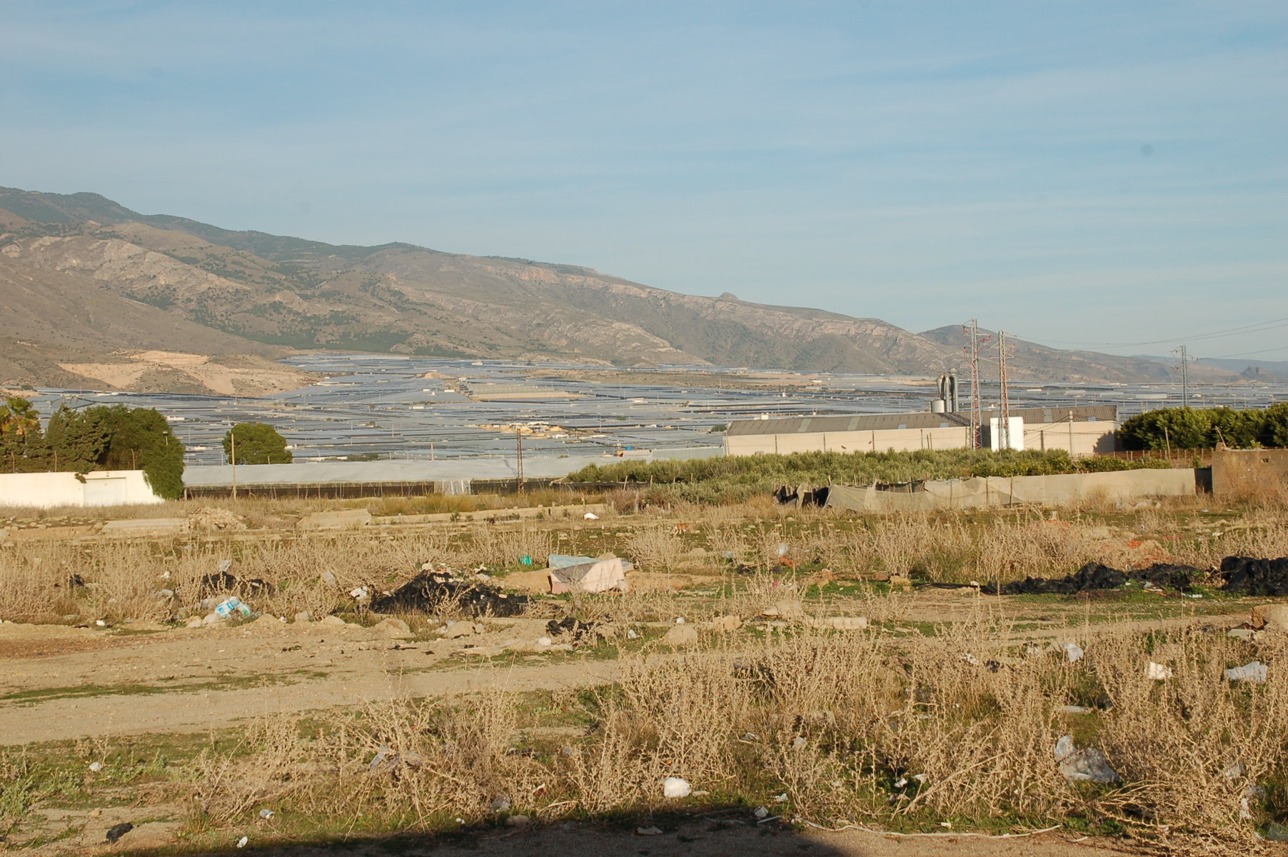 Die ebenen Flächen sind zugebaut mit riesigen Gewächshäusern, die zum Teil hunderte Meter lang sind. Die Gewächshäuser sind zum größten Teil aus Plastikplanen und oft weiter im Norden bis an den Strand gebaut. Um die Häuser herum ist alles zugemüllt. Einige verfallen und mit der Zeit zerstört der Wind die Planen und verteilt das Plastik auf ewig im näheren und weiteren Umfeld. Natürlich fliegt der Müll auch in das Meer.