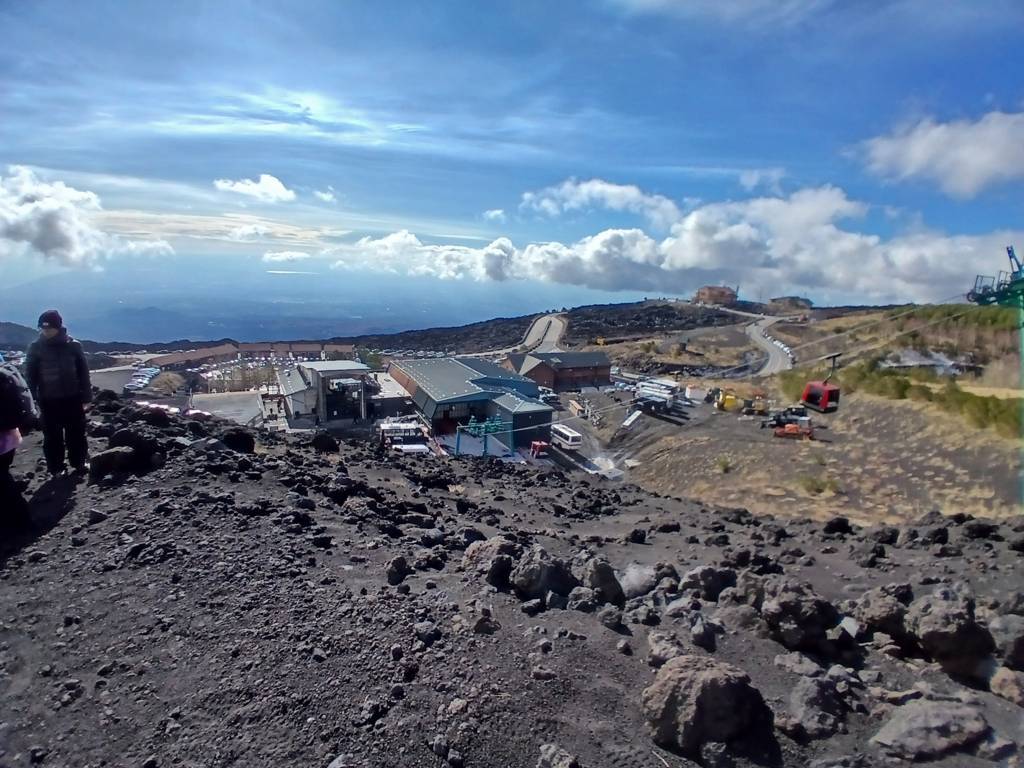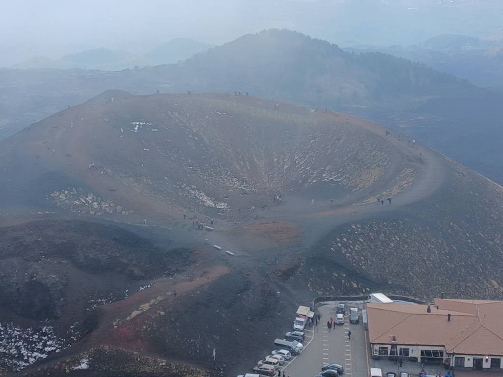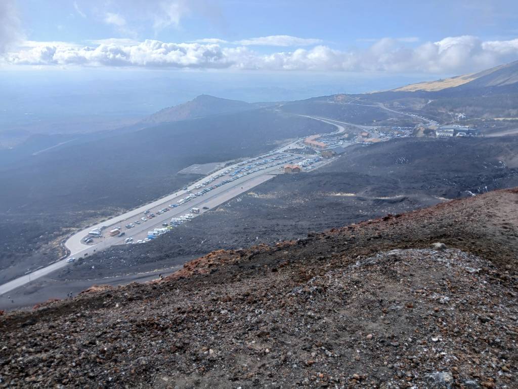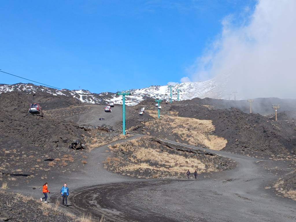 Ich bin etwas abgeglitten, aber das kam mir tatsächlich dort in den Sinn. Ich verbrachte eine kalte, aber angenehm ruhige Nacht und brach nach Frühstück und Gassigehen auf Richtung Gipfel. Es waren nur einige Kilometer zu fahren und ich kam schnell zum obersten Parkplatz. Hier war eine Bergstation mit allem Pipapo errichtet worden. Mehrere Restaurants, Nippesläden und zwei Seilbahnen, hinauf Richtung Gipfel. Und ihr werdet es nicht glauben: Trotz der hohen Warnstufe war das wahrscheinlich einer der belebtesten Orte Siziliens, beinahe wie der Flughafen Palma de Mallorca zur Ferienzeit. Es war gar nicht so einfach, einen Parkplatz zu finden.