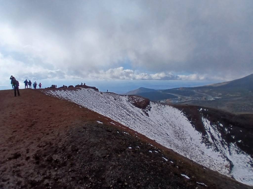 Ich aber, hatte Wut im Bauch und war nicht bereit, an solche Lumpen Geld zu bezahlen. Ich zahle gern für etwas, das einen Wert hat, ein gutes Essen oder eine wirklich gute Flasche Wein. Aber nicht für so etwas, noch nicht mal einen Euro. Ich kehrte um und ging in Richtung Seilbahnstation. Dort angekommen sah ich auf der Preistafel, dass eine einfache Fahrt € 50,- kostete und mit Führer und Fahrzeug nach ganz oben nochmal € 30,- mehr. Also keine Seilbahnfahrt und kein Gipfelerlebnis. Aber unterhalb der Seilbahn gingen die Wanderwege durch die Lavafelder los. Ich machte mich auf und ging ein ganzes Stück den Berg hinauf. Auf dem Schnee konnte man frische feine Asche sehen, die der immer aktive Berg ausgespuckt hatte.