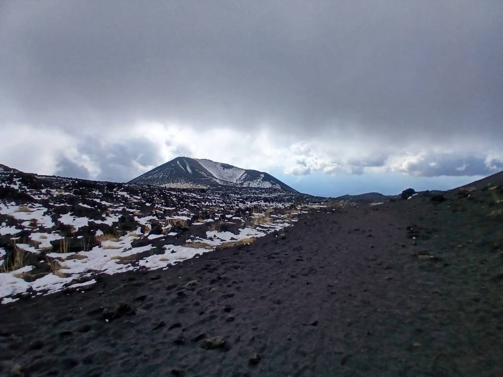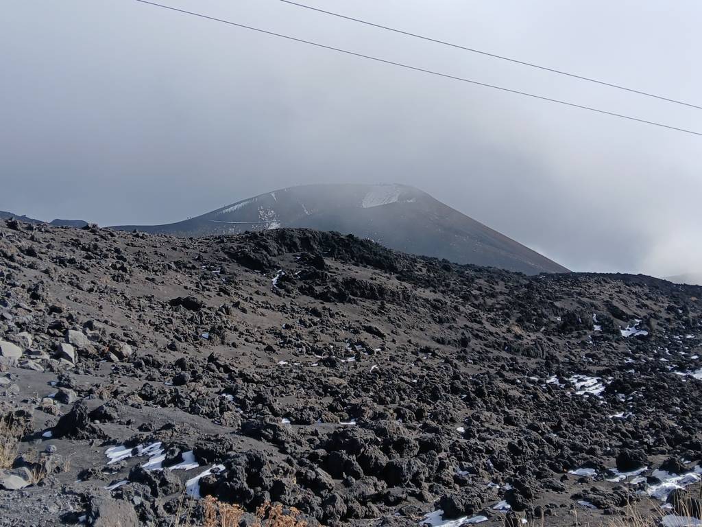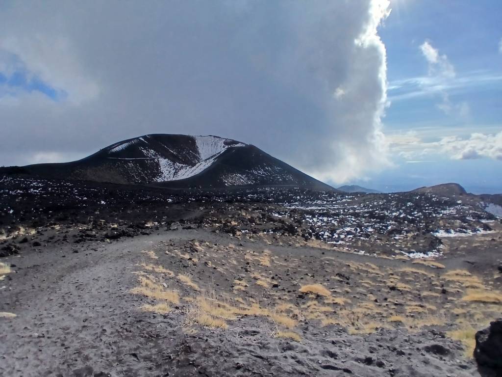 Der Bergstation lag auf circa 2000 Meter Höhe. Zum Krater selbst geht es nochmal 1400 Meter höher. Um den aktiven Hauptkrater befinden sich zahlreiche erkaltete Nebenkrater. Zwischen den beiden „Silvestri Kratern“ verlief die Straße mit den Parkplätzen. Ich fand einen Parkplatz und machte mich mit warmer Jacke und Rucksack wander fertig. Es war kalt, um die null Grad und ich wollte mich etwas warm laufen. Nur ein paar Meter vom Wohnmobil war der Anfang des Weges zu einem der Silvestri Krater hinauf – steil, bestimmt 200 Höhenmeter. Ich ließ Lotte von der Leine und wollte losmarschieren, den von schwarzer Asche bedeckten Weg hinauf.